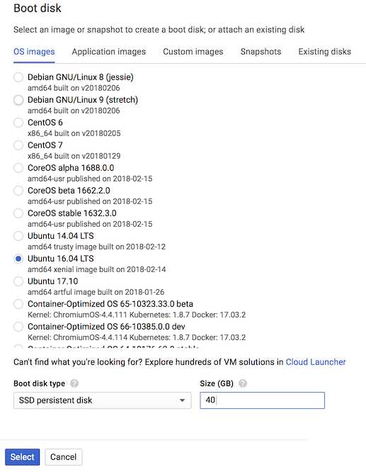 4. Click Change under Boot disk to select the size, type, and desired operating system. GitLab supports a variety of linux operating systems, including Ubuntu and Debian. Click Select when finished.